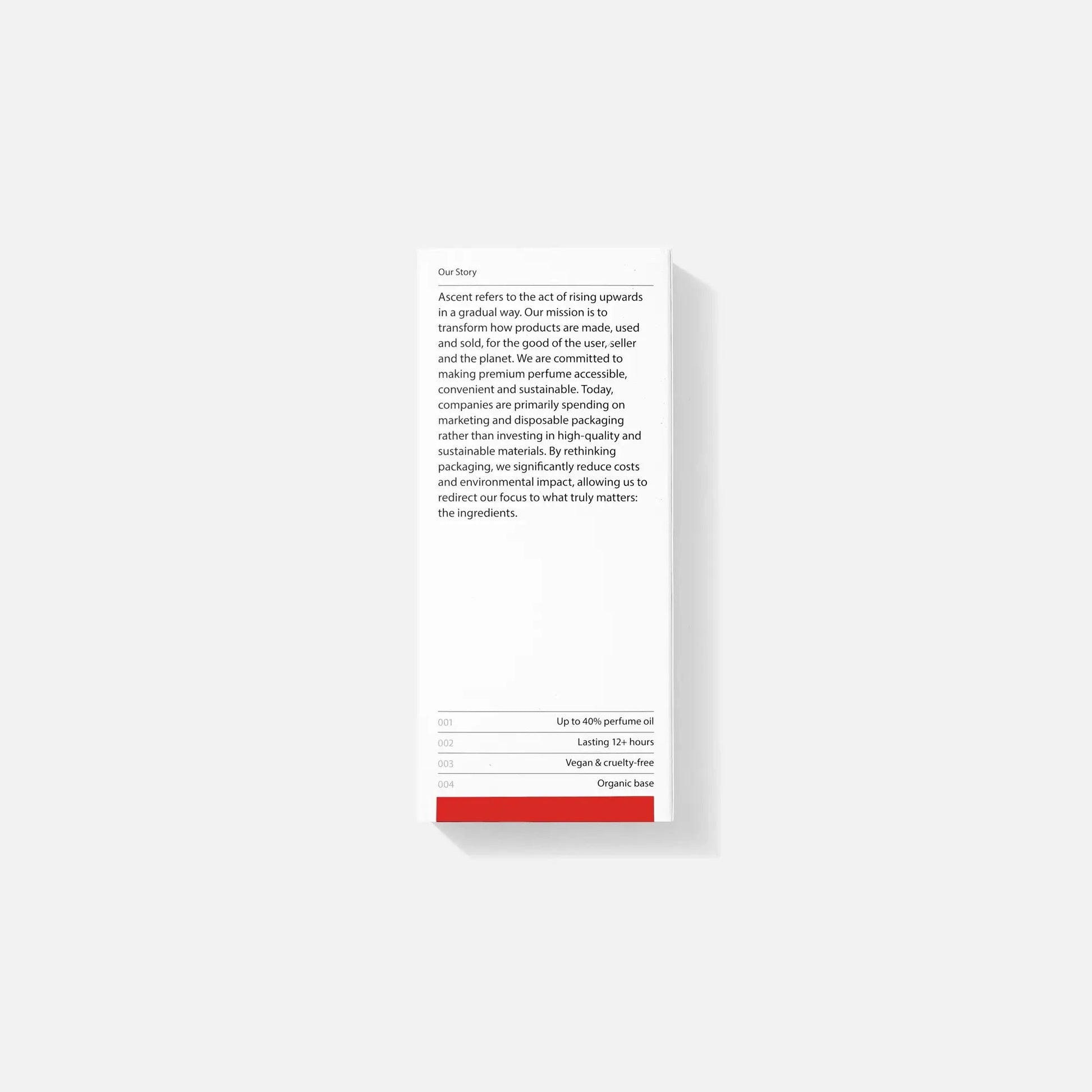 Ascent Red is a bold and sophisticated amber-woody extrait. With an opulent 25% perfume oil concentration, it offers 12+ hours of lasting power, leaving anunforgettable trail of warmth and depth. Opening with a rich saffron note, Ascent Red unfolds into a luxurious heart of supple leather and resinous benzoin, evoking a sense of confidence and refinement. The fragrance lingers with a deep and sensual base of agarwood, creamy vanilla, and tonka bean, creating an intoxicating warmth that captivates from day to night. Designed to be worn and loved by all, Ascent Red is vegan, cruelty-free, and crafted with an organic base. A statement scent that thrives in cooler seasons yet remains versatile enough for any occasion.