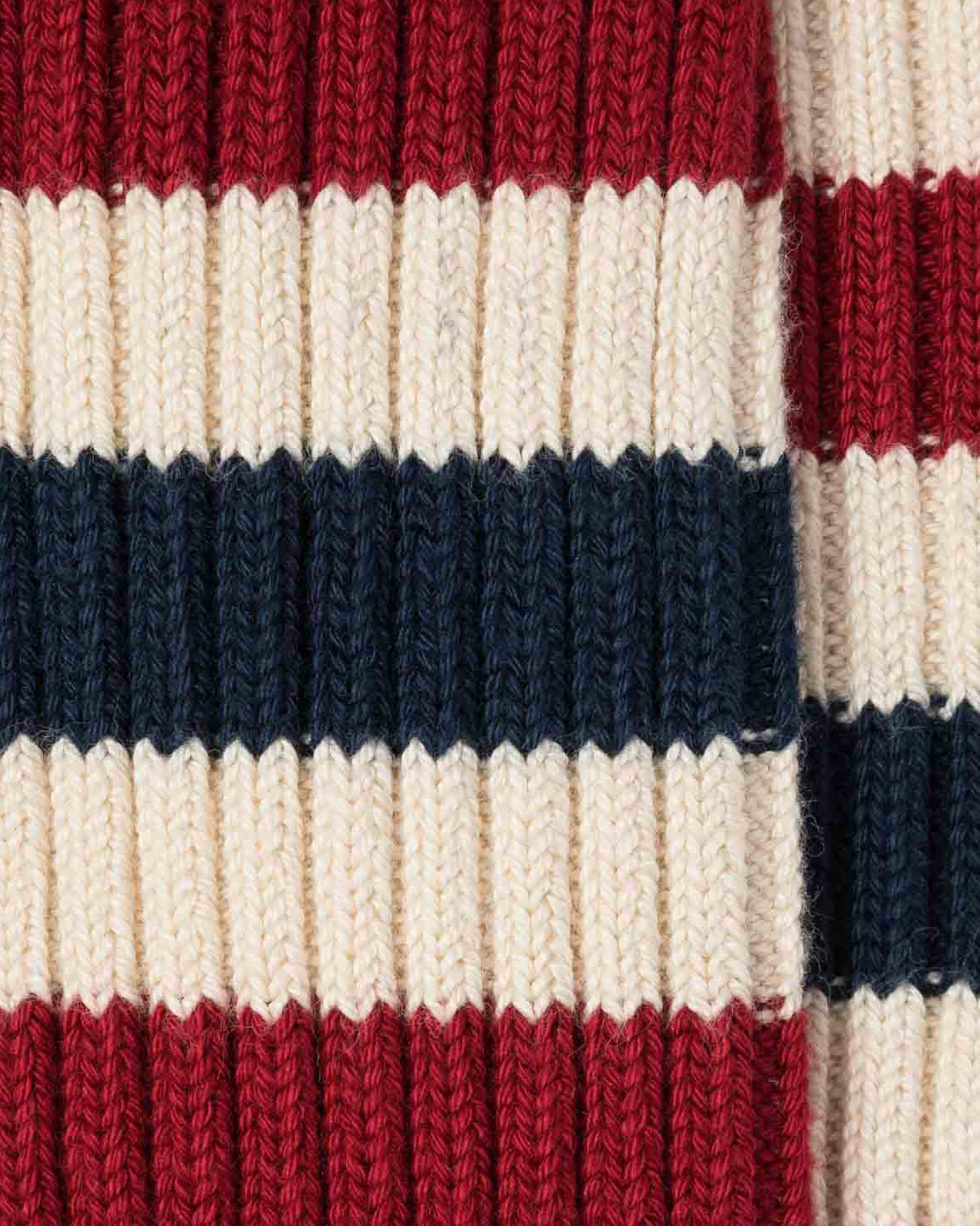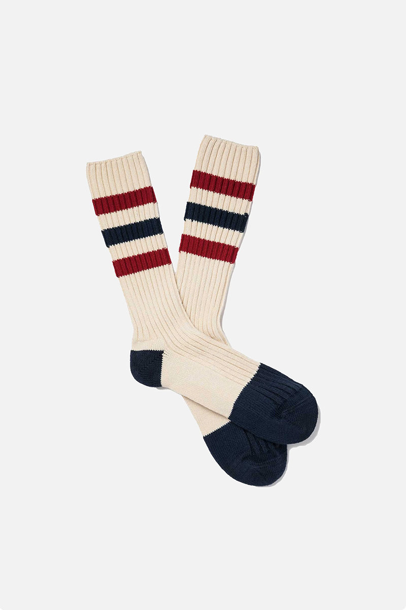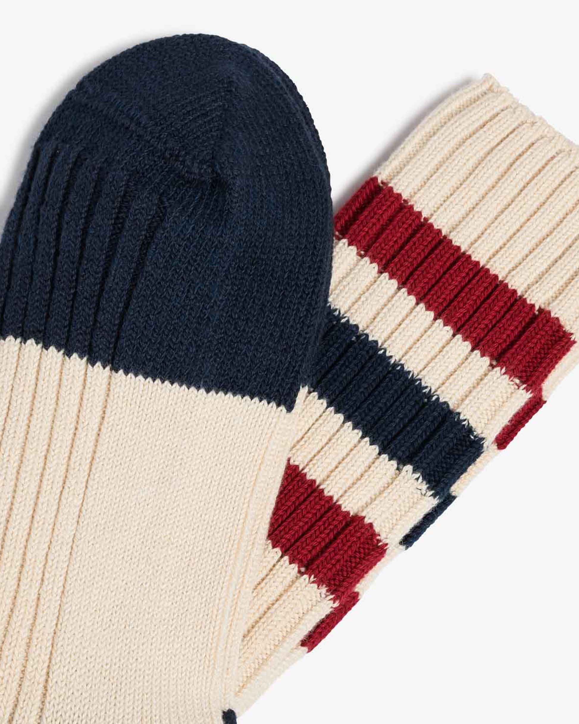 These thicker, ribbed socks are made from organic cotton. They have a casual and rather sporty look, but they are a luxury version of the athletic sock. Indeed, their thickness and the quality of the yarn, both soft and super airy, give them a vintage look. They are available in ecru with colorama stripes.