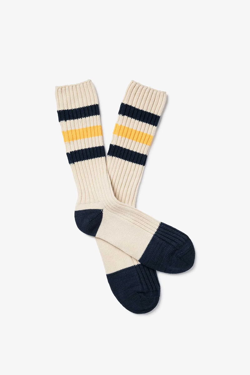 These thicker, ribbed socks are made from organic cotton. They have a casual and rather sporty look, but they are a luxury version of the athletic sock. Indeed, their thickness and the quality of the yarn, both soft and super airy, give them a vintage look. They are available in ecru with colorama stripes.