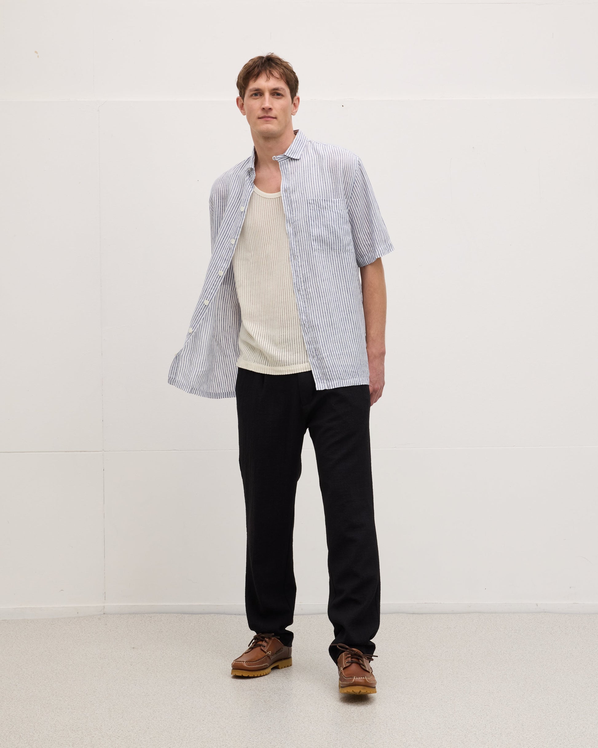 Granting the most flattering fit thanks to its relaxed silhouette and classic thin stripes, the Santi is the perfect summer piece to layer over your favourite pair of shorts or smart trousers. Crafted from 100% breathable linen, it’s your go-to piece for any occasion, anytime, anywhere.