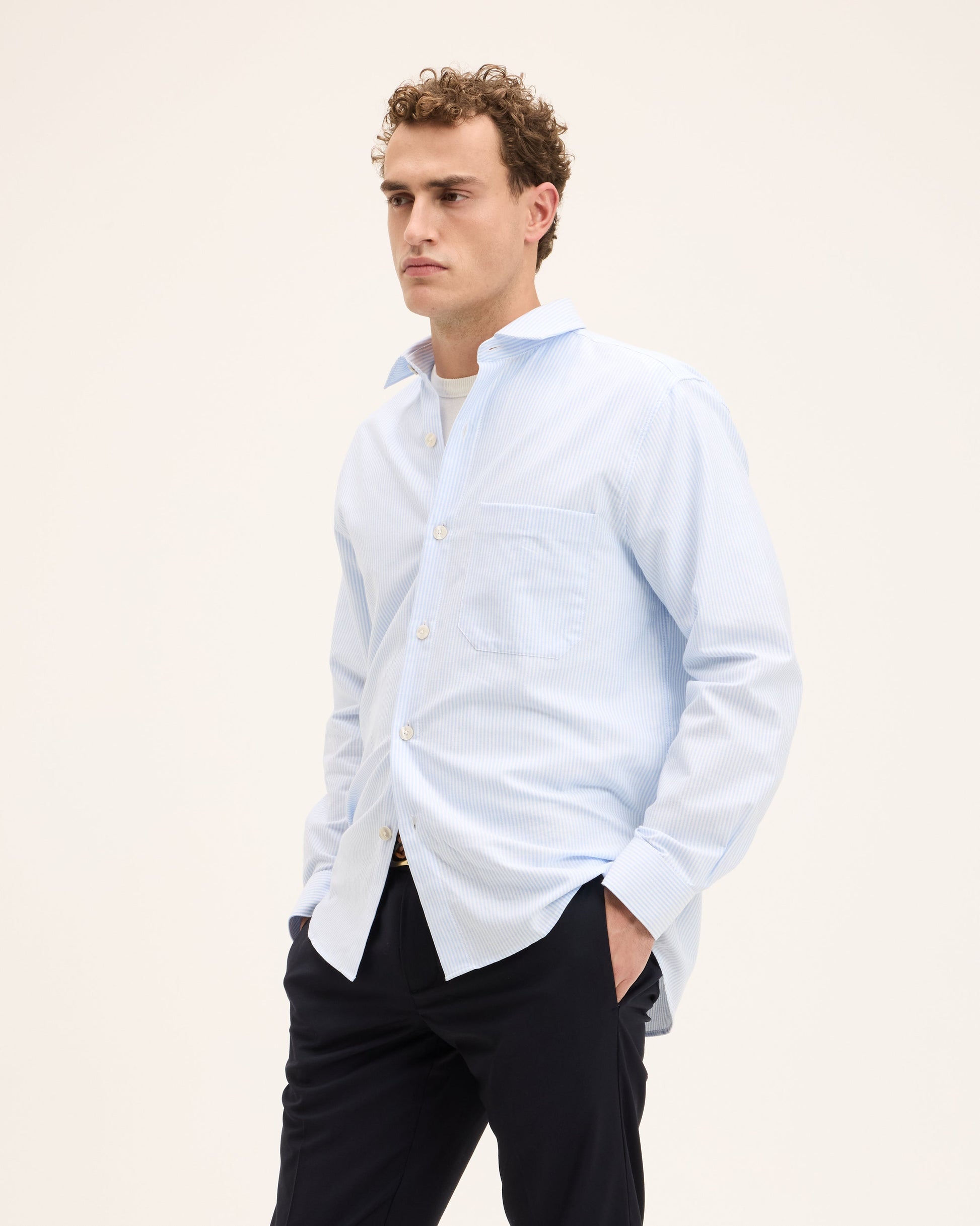 A classic shirt with a clean and relaxed fit. The fabric has a smooth surface and feels comfortable directly on the skin. An easy piece that fits naturally into a daily wardrobe.
